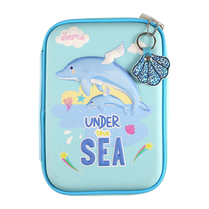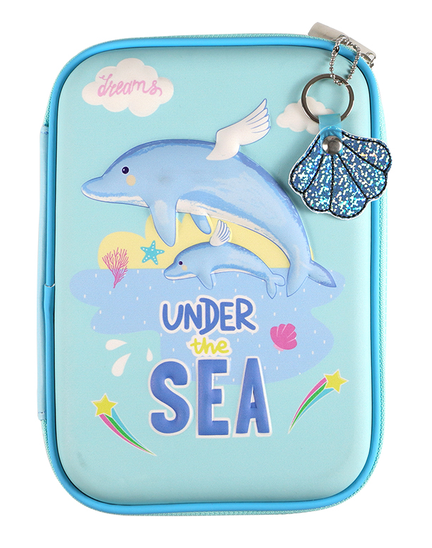 1. 3D pencil case, 16.6cm*23cm*3.8cm; material, PU with EVA; brushed fabric and polyester mesh inside; blue zipper.