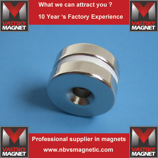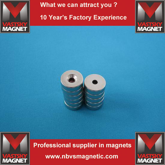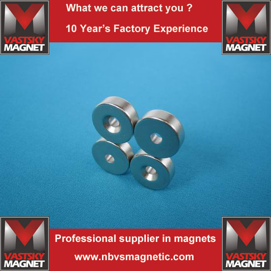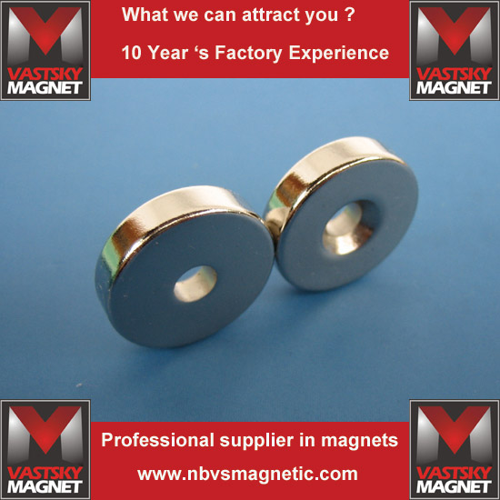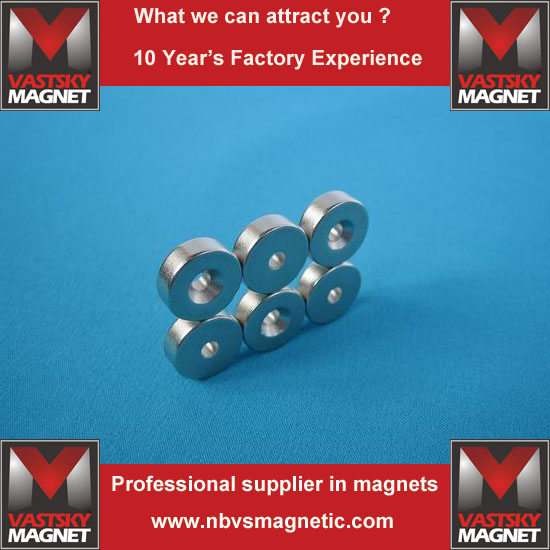 Ningbo Vastsky Magnet Company is specialized in making ndfeb countersunk hole magnets. It has hundreds of wire cutting machines running day and night. We can make high quality sintered ndfeb hole magnet countersunk grade N35 N38SH N38UH N38 N38M, N38H , esepecially for those motors with certain working temperature requirement. We can supply oven test to ensure temperature resistance.